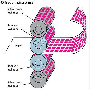Offset printing, also called offset lithography, is a method of mass-production printing in which the images on metal plates are transferred (offset) to rubber blankets or rollers and then to the print media. The print media, usually paper, does not come into direct contact with the metal plates. This prolongs the life of the plates. In addition, the flexible rubber conforms readily to the print media surface, allowing the process to be used effectively on rough-surfaced media such as canvas, cloth or wood. The main advantage of offset printing is its high and consistent image quality. The process can be used for small, medium or high-volume jobs.